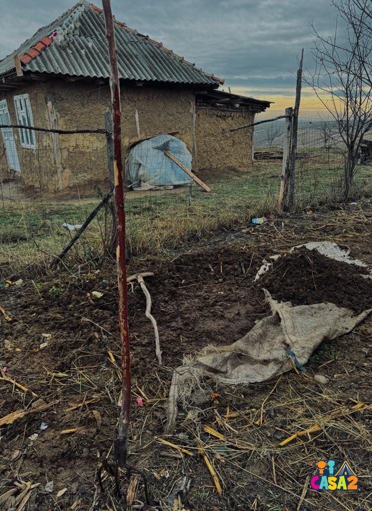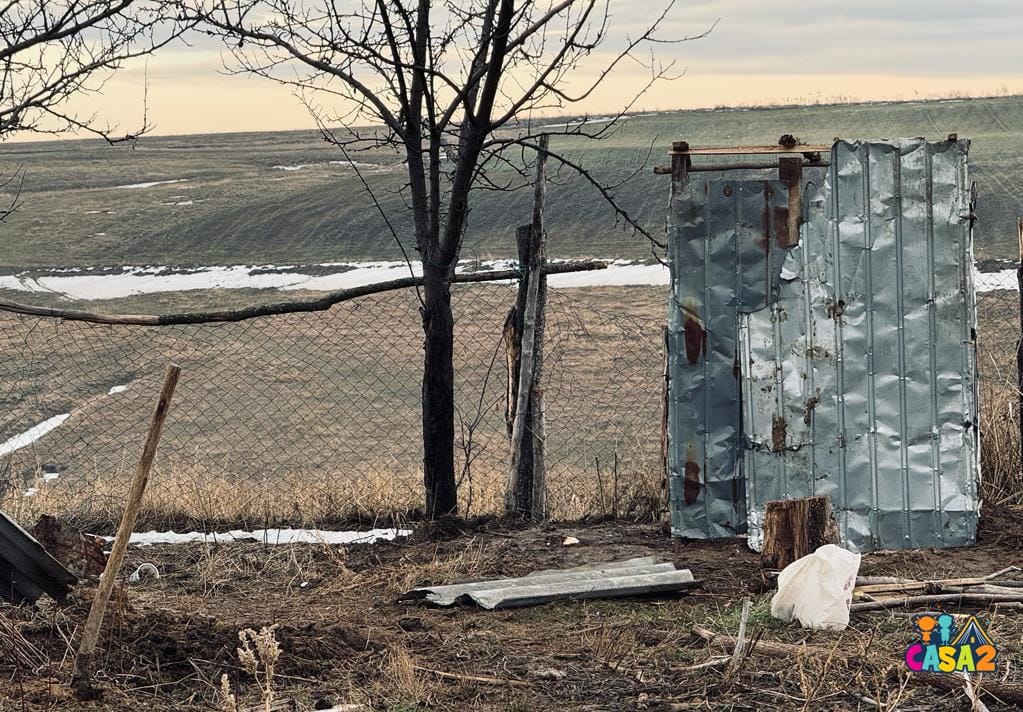 L-am găsit construind un WC în fundul curții, ajutat fiind de un frate al său. Pereții din tablă ruginită și îndoită ai WC-ului erau deja montați când am ajuns noi.